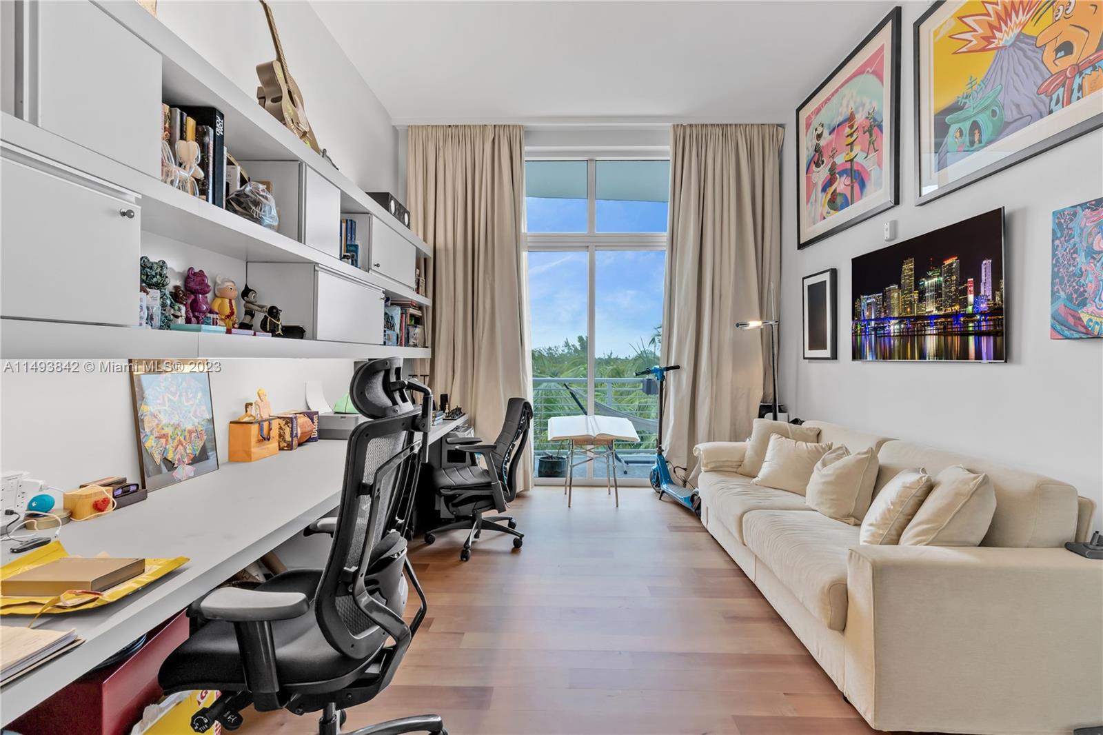 Tucked away on Meridian Ave along Miami Beach Golf Course this quiet, luxury boutique style building has all the amenities & comforts to live your desired Miami Beach lifestyle. One of a kind unit designed by Nora Lippuner & manufactured by NUSSLI GROUP in Switzerland create a high-end yet cozy atmosphere. Inside you will find loft style 11.5-foot ceilings, 2 bed + 2.5 bath split floor plan, open kitchen & custom lighting casts a warm & inviting mood. Additional upgrades include a 4K audio system with sound in all rooms, soundproofed walls & floors, two corner parking spaces w/space for storage & EV charger, balcony access from all rooms, wine coolers, custom drapes, custom furniture, matte wood floors, projection theater system, brand new LG chef’s refrigerator & Samsung washer & dryer.