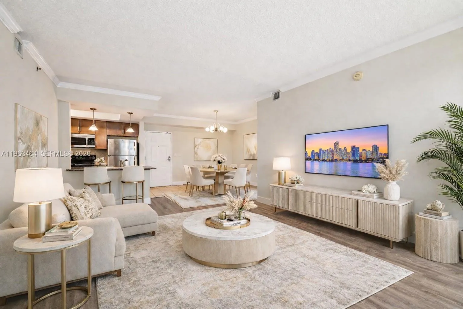 Completely remodeled residence at The Olympus Condominium with stunning marina and Intracoastal views. This 1,040 Sq ft unit offers bright, open living space featuring a brand-new kitchen, updated bathrooms, new A/C, wood floors throughout, and a spacious primary suite with a custom walk-in closet.