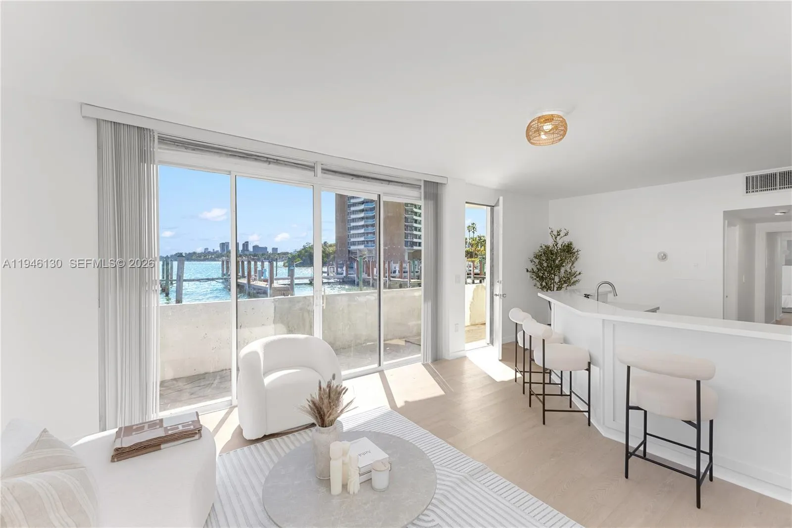 Fully renovated and offered fully furnished, this Bayfront residence at Palm Bay Condo brings together Units 1G and 1H to create a spacious one bedroom, two bathroom home with bright South facing interiors and direct views of the marina and Biscayne Bay.